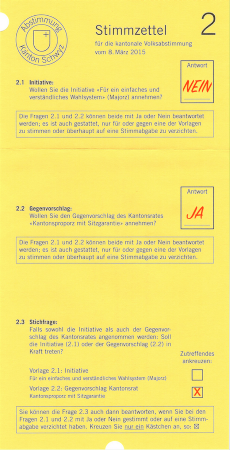 Bei einer Majorzwahl werden ungeachtet der Parteienstärke jene Kandidaten mit den meisten Stimmen gewählt. FDP.Die Liberalen wollen jedoch den Kantonsproporz, weil nur dieses Wahlsystem die Meinungsvielfalt im Kantonsrat garantiert. Die Vertretung einer Partei im Parlament soll exakt ihrem Wähleranteil entsprechen, systembedingte Bevor- und Benachteiligungen von Parteien sind zu verhindern. Der Proporz hat seit 117 Jahren im Kanton Schwyz Tradition und soll weitergeführt werden.