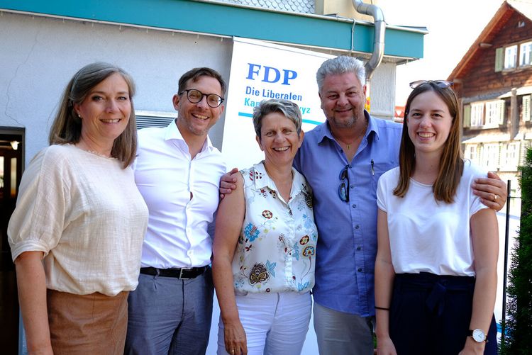Entspannte und fröhliche Atmosphäre in der Ochsen-Gartenwirtschaft in Rothenthurm. Von links: Kantonsrätin Sibylle Ochsner, Kantonsrat Heinz Theiler, FDP-Kantonalpräsidentin Marlene Müller-Diethelm, Ortsparteipräsident Reto Casagrande und FDP-Kantonalsekretärin Julia Cotti.