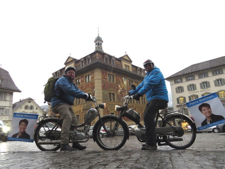 Sie sind nicht einmal FDP-Mitglieder, aber ganz offensichtlich Fans von Regierungsrätin Petra Steimen-Rickenbacher. Zimmermann Urs Böni und Architekt Roland Hüppi aus Wollerau fuhren am Mittwoch mit ihren zwei über 50jährigen Sachs-Zweitakt-Töfflis von Siebnen quer durch den Kanton nach Schwyz zum dortigen Rathaus. Wind, Regen und Schneetreiben machte den beiden Gewerblern, die mit Petra Steimen-Fahnen an ihren «Sackgeldverdunster», nostalgischen Helmen und einem Rucksack voller Brissagos und Stümpen ausgerüstet waren, nichts aus. «Wir sind zähe Kerle», meinte Urs Böni. «Zudem sind wir mit unseren Töfflis auch schon via Disentis und Lukmanierpass ins Tessin gefahren.» Diesmal war man nicht auf einem Ferientrip sondern auf Wahlmission für die Wollerauer Regierungsrätin unterwegs. Und man sei dadurch in jeder Gemeinde mit etlichen Passanten in Kontakt gekommen. «Das war grossartig und sehr interessant», sagte denn auch Roland Hüppi. Es sei halt schon ein Vorteil, wenn man so langsam unterwegs ist. «Schliesslich sind unsere Töfflis nicht frisiert. Wir wollen ja auch was sehen von der Gegend.» Und das Wetter war bei dem Gaudi sowieso nebensächlich.