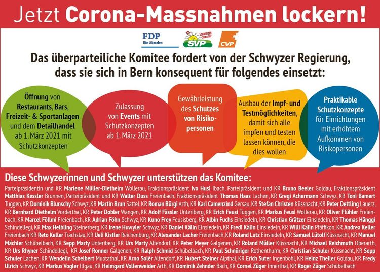 Die Wirtschaft und die Bevölkerung sollen ihre Freiheit zurückerhalten. Deshalb fordern wir die Schwyzer Regierung auf, sich beim Bundesrat für praktikable, faktenbasierte, alltagstaugliche und langfristig orientierte Massnahmen einzusetzen, damit der volkswirtschaftliche Schaden begrenzt und demzufolge die nachfolgenden Generationen nicht noch mehr belastet werden und die wirtschaftliche und private «Normalität» wieder seinen Lauf nehmen können.
